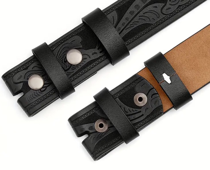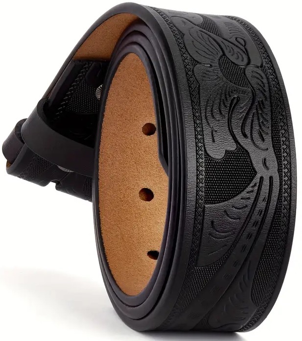 | Genuine leather belt from Bison Denim. Black leather belt with a timeless embossed pattern. This belt is ready for your buckles together they will look amazing. ![]() Click to Enlarge ![]() Click to Enlarge ![]() Click to Enlarge | Approximate size depends on type of buckle fitted, waist size 38 to 44 inch, width 1.5 inch. |